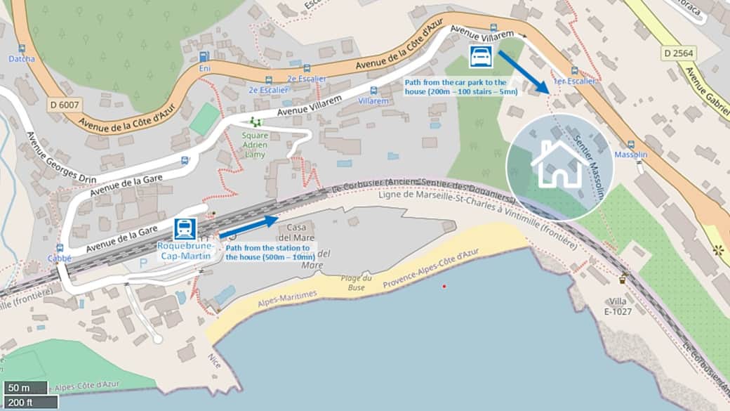 2. Il est possible de venir en train, la gare est "Cap Martin Roquebrune" . Depuis cette gare, l'accès au logement se fait par le sentier des douaniers, en parcourant 500 mètres (10 min à pied, 30 marches à remonter).